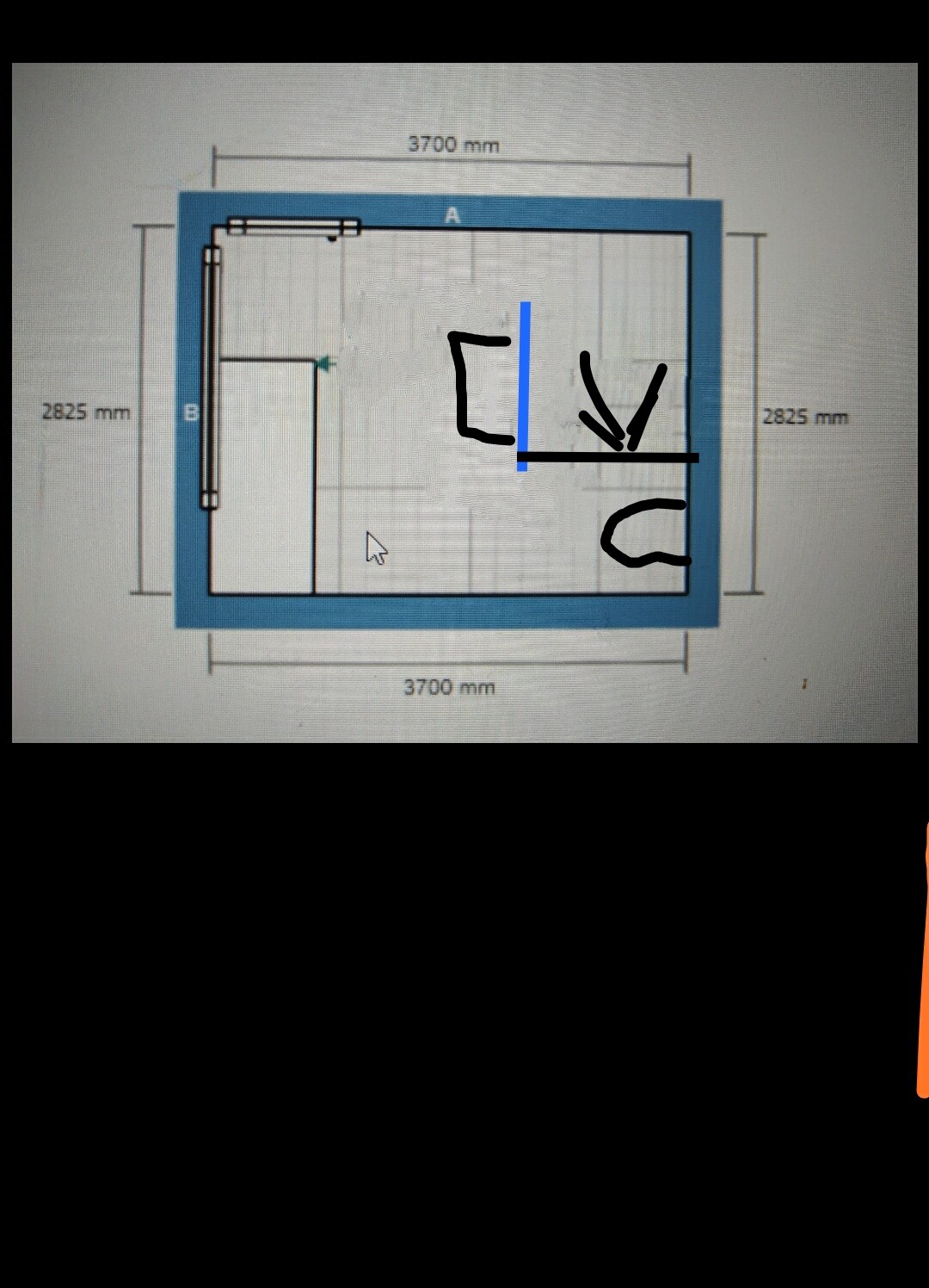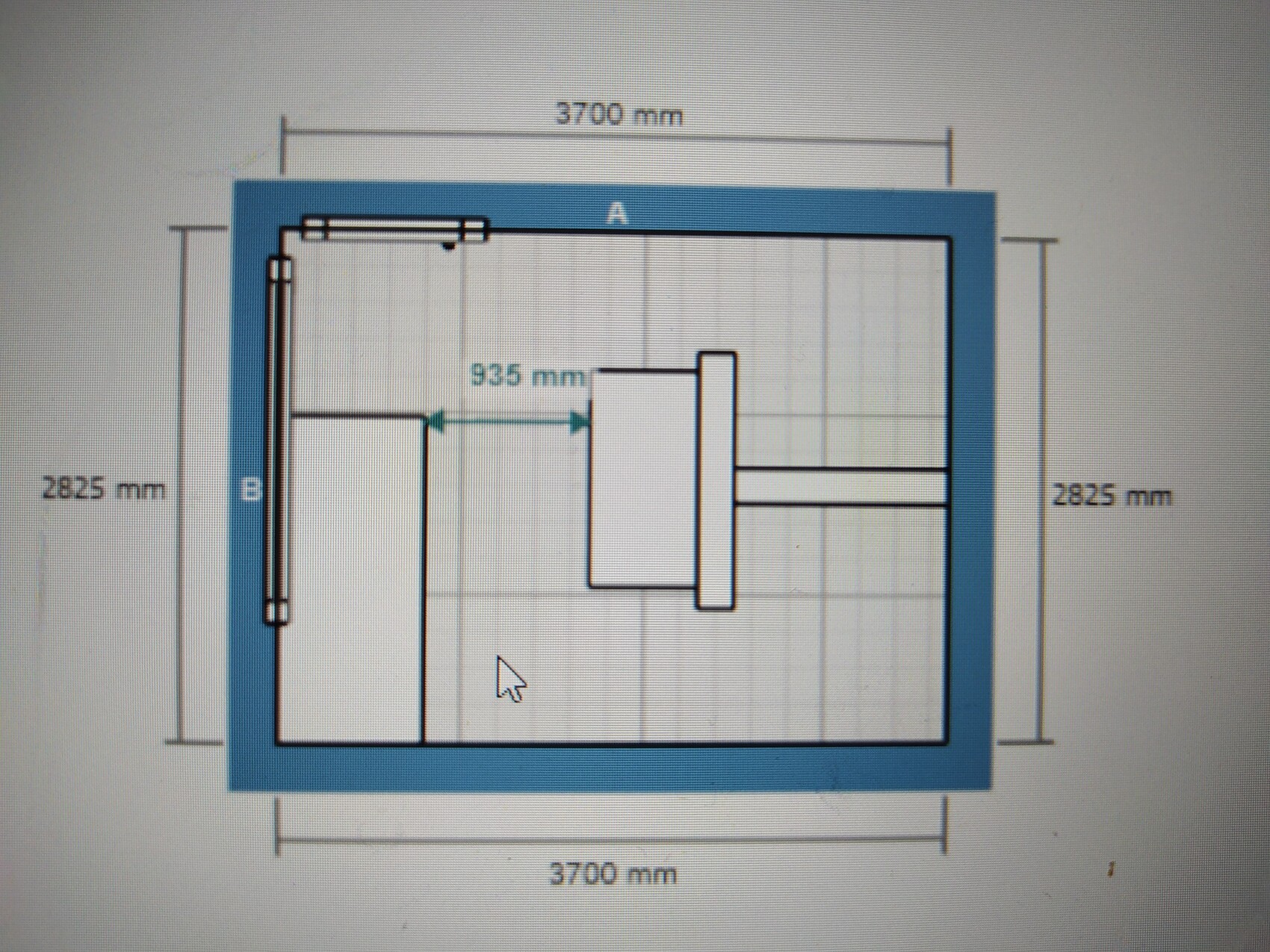 Grundriss eines Raums mit Außenmaß 3700x2825 mm, Tür links, blauer Rahmen und Anmerkungen.