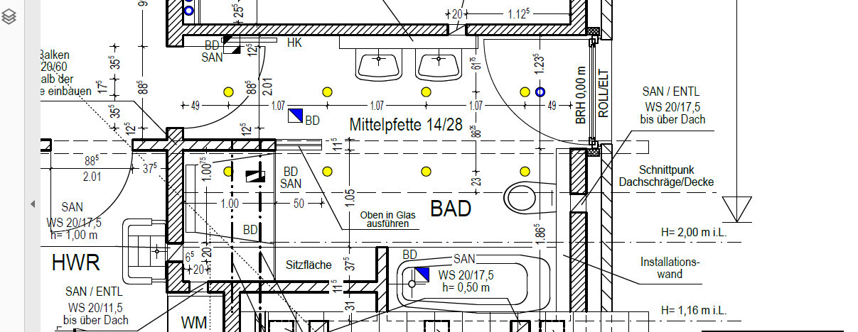 Die Badplanung stammt von unserem Architekten. Ein Weg zum Sanitärmenschen wird wahrscheinlich noch folgen. Habt ihr Ideen? Das Bad ist etwas seltsam geschnitten, das ist aber unseren anderen Wünschen geschuldet, die der Grundriss so super berücksichtigt, daher sind wir den Tod dieses Badezimmers gestorben. Eigentlich wollten wir ja gerne eine T-Lösung, ich glaube dafür ist das Bad aber zu knapp. Insgesamt finde ich es so auch total in Ordnung, ich brauche bspw. keine freistehende Badewanne oder so, das einzige was mich etwas stört, ist, dass man direkt auf die Toilette schaut wenn man reinkommt....die hätte ich gerne etwas versteckt. Habt ihr Ideen für eine neue Anordnung? Die "Ecke" der Dusche ist ein Rücksprung in den Giebel um die Schräge dort zu umgehen.