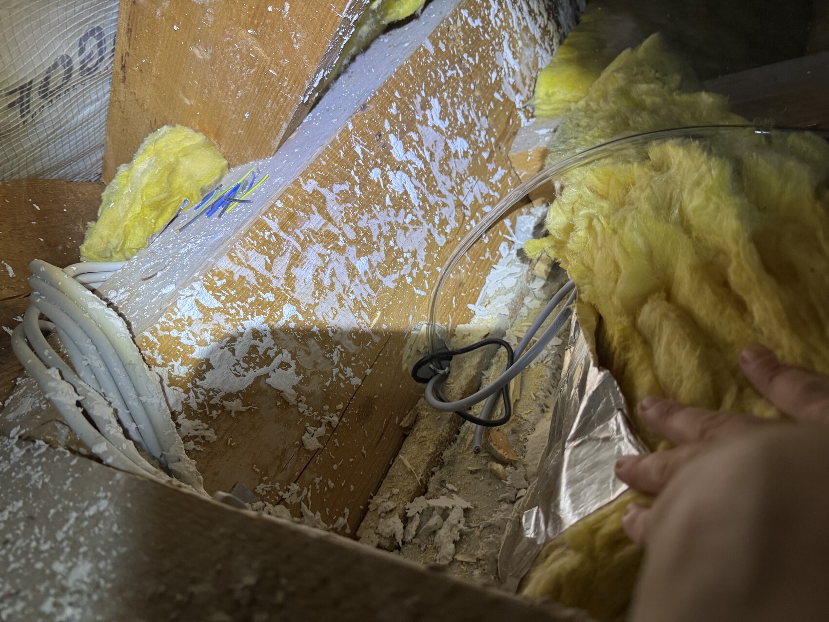 Im Wohnzimmer ist er dabei auf einen tragenden Balken gestoßen, wo er nun von unten einen Durchbruch seitlich reingebohrt hat. Vom Dachboden hat er dann vom Rand noch seitlich in den Durchbruch von unten gebohrt, so dass quasi ein 90° Kanal durch den Balken, bzw. am Rand des Balkeninneren verläuft.