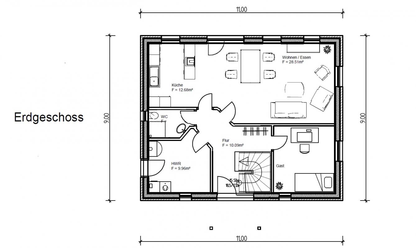 Grundriss Erdgeschoss eines Hauses mit Küche, WC, HWR, Flur, Gastzimmer und Wohnbereich.