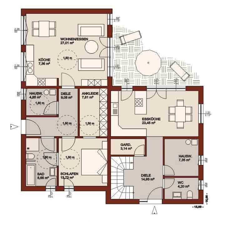 Aber so habe ich ja schon mal einen Anhaltspunkt, in wie fern man das Gäste-Duschbad ändern müsste, es ist ja auch noch potenzial drin, der Hauswirtschaftsraum könnte durchaus kleiner werden da wir dort z. B. nur eine Heizungsanlage stehen haben werden die wenig Platz benötigt und ja an sich nur nötige Dinge wie Waschmaschine, Trockner und Gartenklamotten sein werden