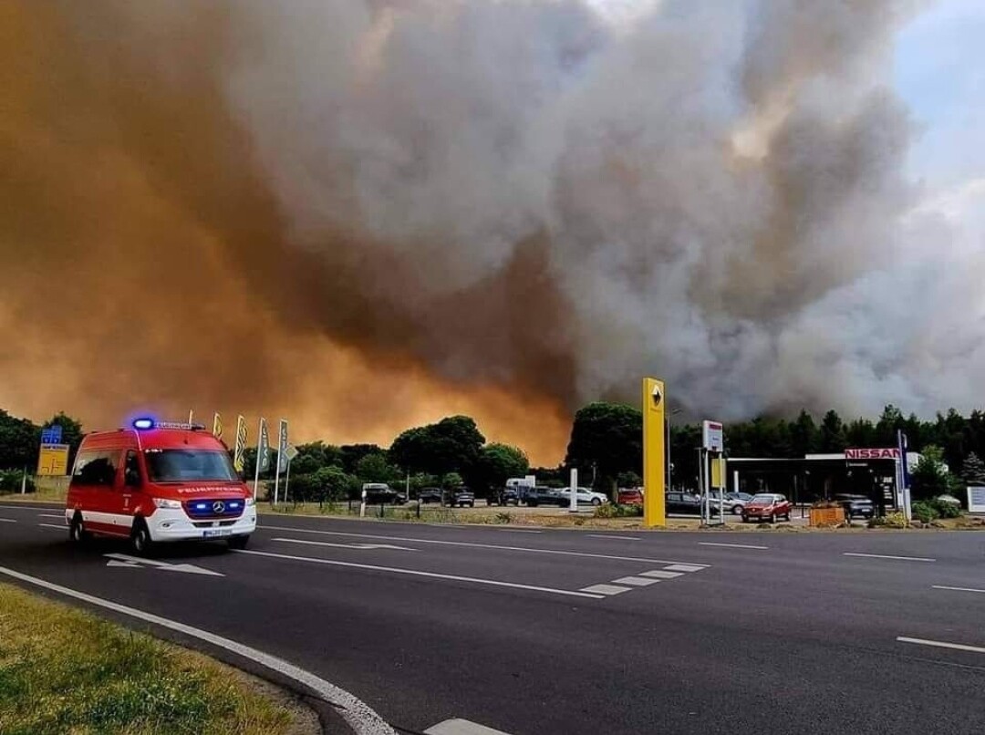 Großer Waldbrand am Straßenrand mit dichter Rauchwolke; Rettungswagen mit Blaulicht auf Autobahn