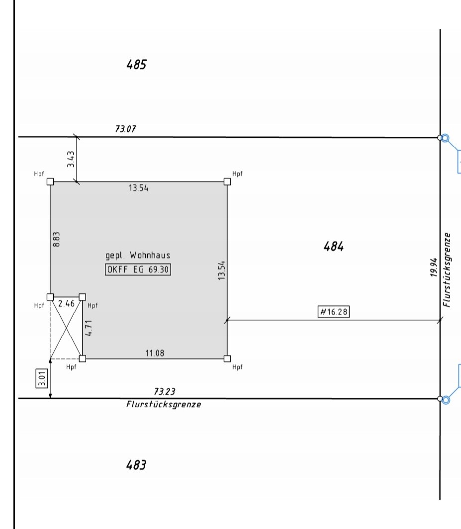 Die 16,28m ist die vorgeschriebene Baugrenze. Die wollten wir voll ausschöpfen, damit der Abstand zu Strasse möglich gross ist. Haben abzgl. Haus noch einen ca. 42mx 20m Garten. Grenzabstände sind je 3m. Rechts ist bereits bebaut, da wollten wir den etwas größeren Abstand. Links ist Wald.