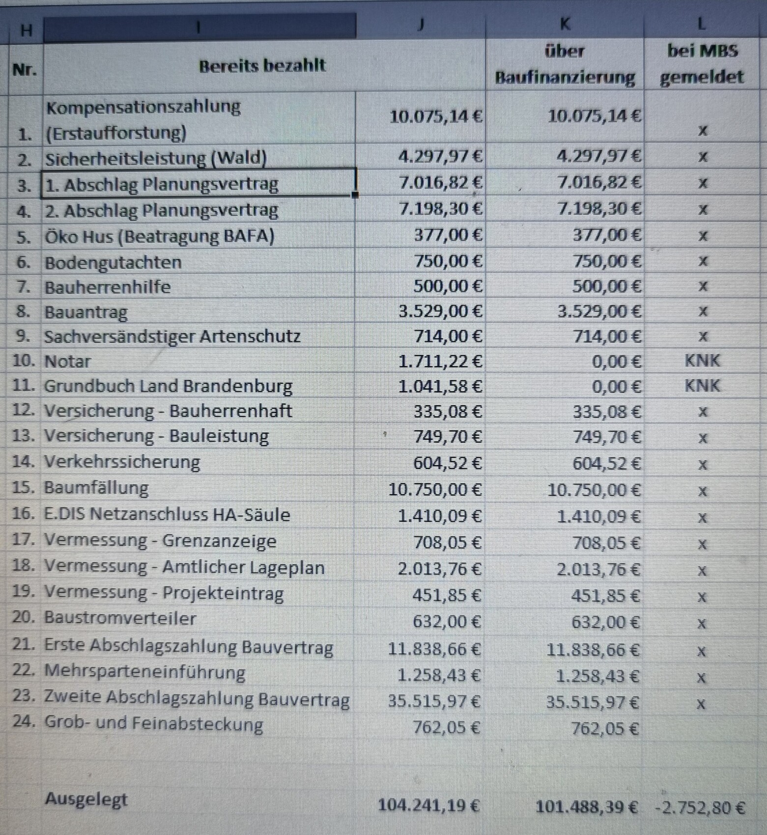 Lass die 3 vorn weg, dann passts bei mir. Was verursacht denn so hohe Kosten beim Bauantrag ?3,5k inkl. Umwandlung. Davon hat die Forstbehörde 1,8k kassiert.