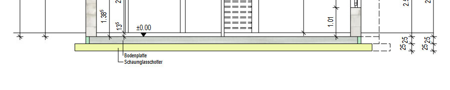 Technische Zeichnung eines Fundamentbereichs mit Bodenplatte, Daemmung und Schaumglas.