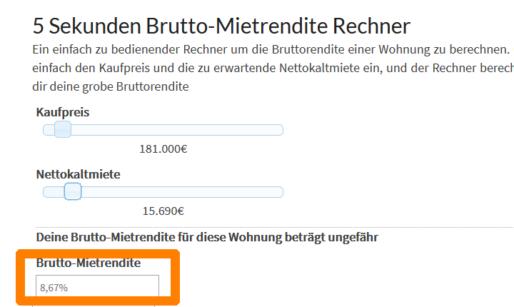 Bei 100 qm Wohnfläche ergäbe sich aus deinen Werten (1800/qm und 13/qm Miete) eine Bruttomietrendite
