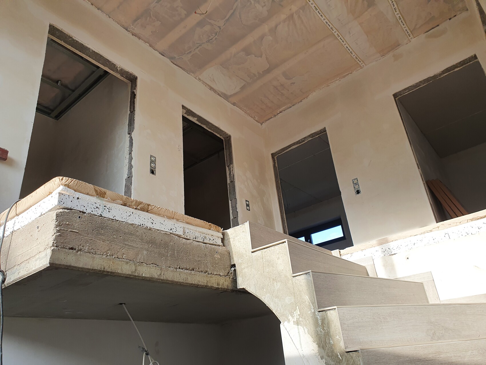 Ist die oberste Schicht auf dem Podest der Treppe der Estrich mit solch interessantem Muster?Bis 1.5 wird schon klappen irgendwie ;-)