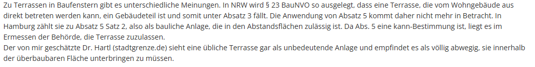 Also er meint, da Terrassen nicht in § 14 Baunutzungsverordnung als Nebenanlage aufgeführt sind, sind es Gebäude oder Gebäudeteile. und können deshalb nicht als privilegiert gelten. Muss also in die Baugrenze.