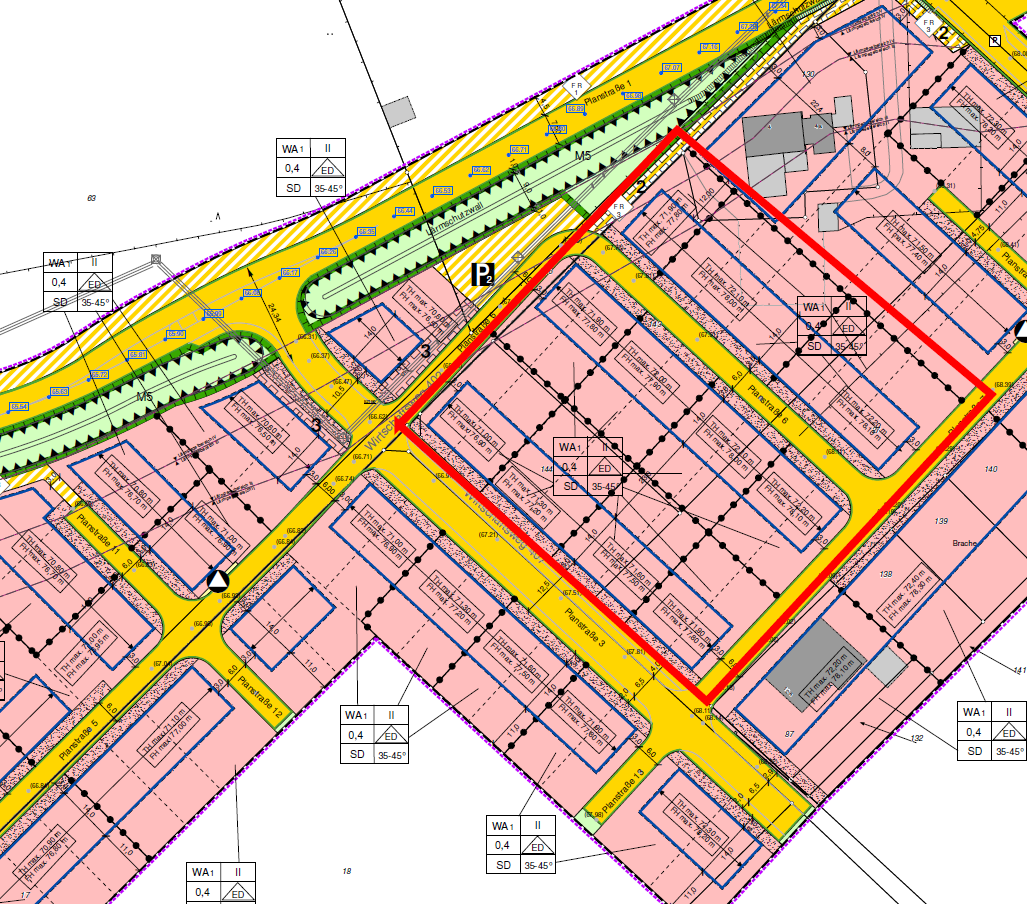 Hier ein Ausschnitt aus dem Bebauungsplan. Im rot markierten Bereich wird mein Grundstück liegen.
