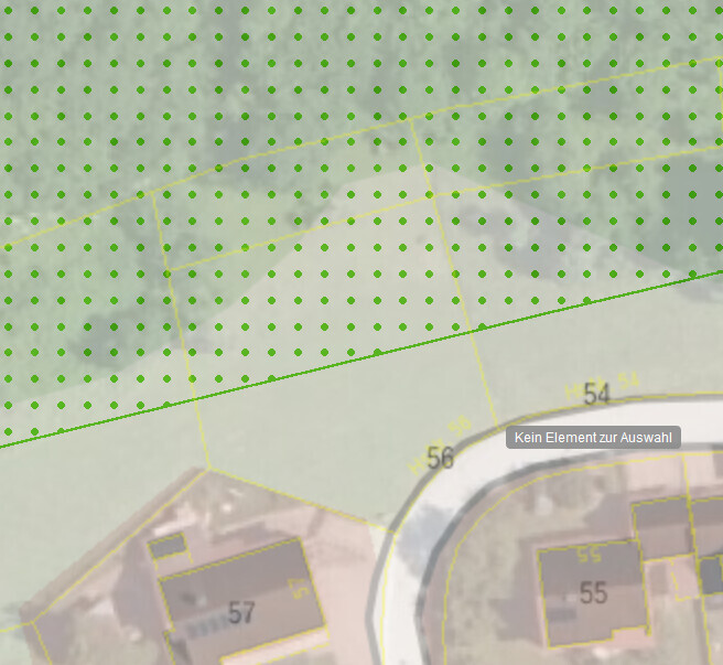 Katasterkarte: gelbe Parzellenlinien, grüne Punkte über dem Gelände, blaue Linie an der Straße.