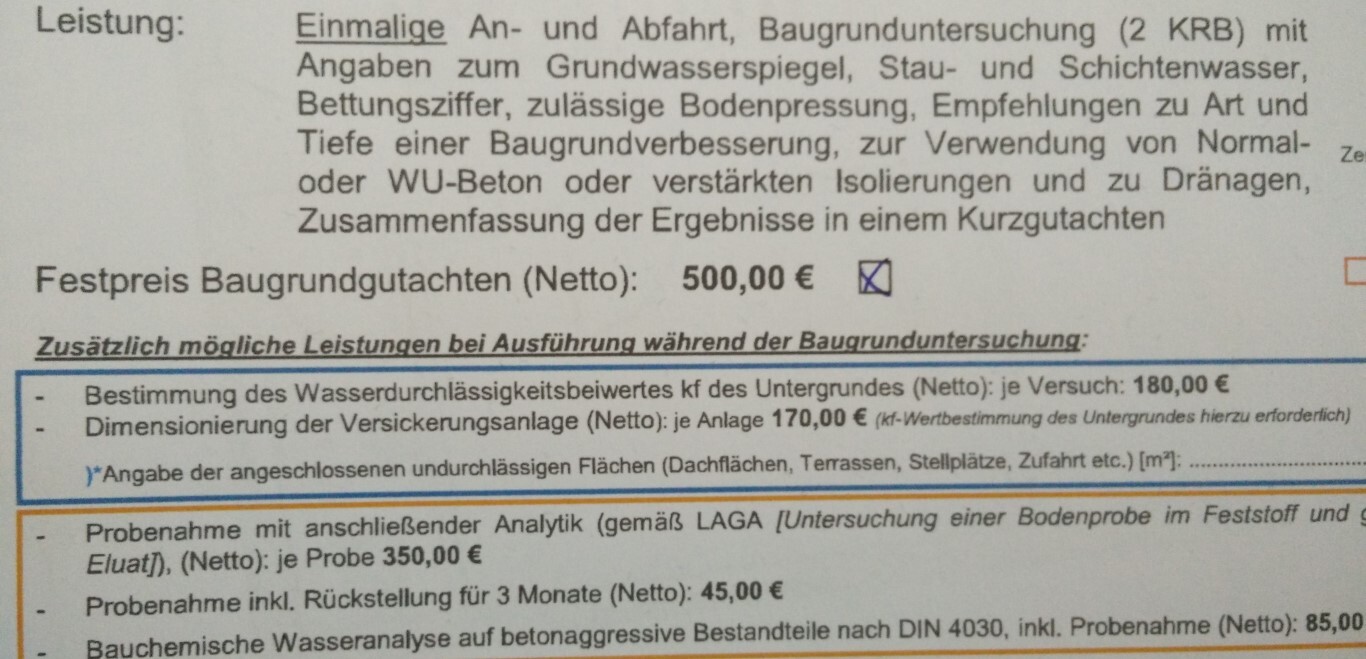 Es gibt es Grundleistungspaket, das der Bodengutachter liefern muß, damit. insbesondere der Statiker ausreichende Informationen für seine Planung bekommt. Die sollte der Gutachter ganz "normal anbieten zum Preis von etwa brutto €1.200 -. Ist der Preis wesentlich niedriger, fehlen Grundleistungen. Die Untersuchung der Bodendurchlässigkeit (Versickerungsbeiwert) ist sinnvoll, wenn durch eine Feuchtebelastung des Bodens voraussichtlich Bauwerksabdichtungen nach DIN 18195-4/9 oder Gebäudedrainagen nach DIN 4095 geplant werden müssen.