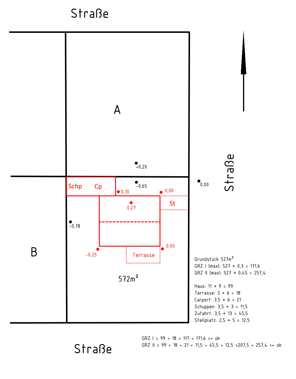 Auf dem Lageplan sind die unscharf geschriebenen Werte die, wie sie aktuell sind und die scharf geschriebenen, die Planwerte.