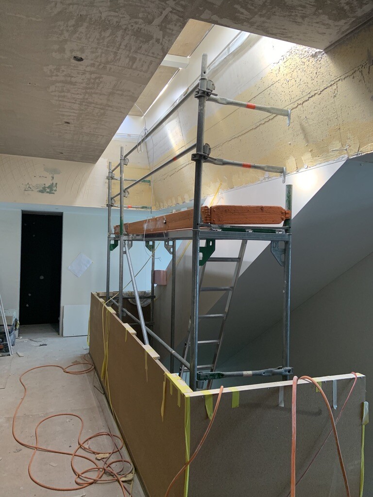 Außerdem wurden im Kellergeschoss Steckdosen und Lampen eingebaut, im EG die Akustikdecke montiert und im Attikageschoss Terrasse abgedichtet: