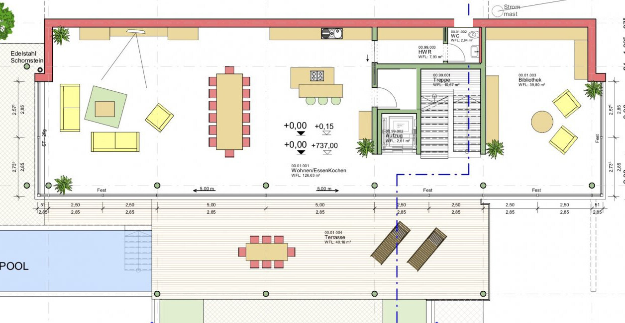 Pool sieht gut aus, aber ich persönlich würde den auch gern nicht nur im Sommer nutzen. So fände ich es gut, wenn er zum Teil noch in's Haus integriert werden würde. Als Anregung vielleicht noch: Für mich käme nur ein Salzwasserpool in Frage. Das Wasser ist viel angenehmer.
