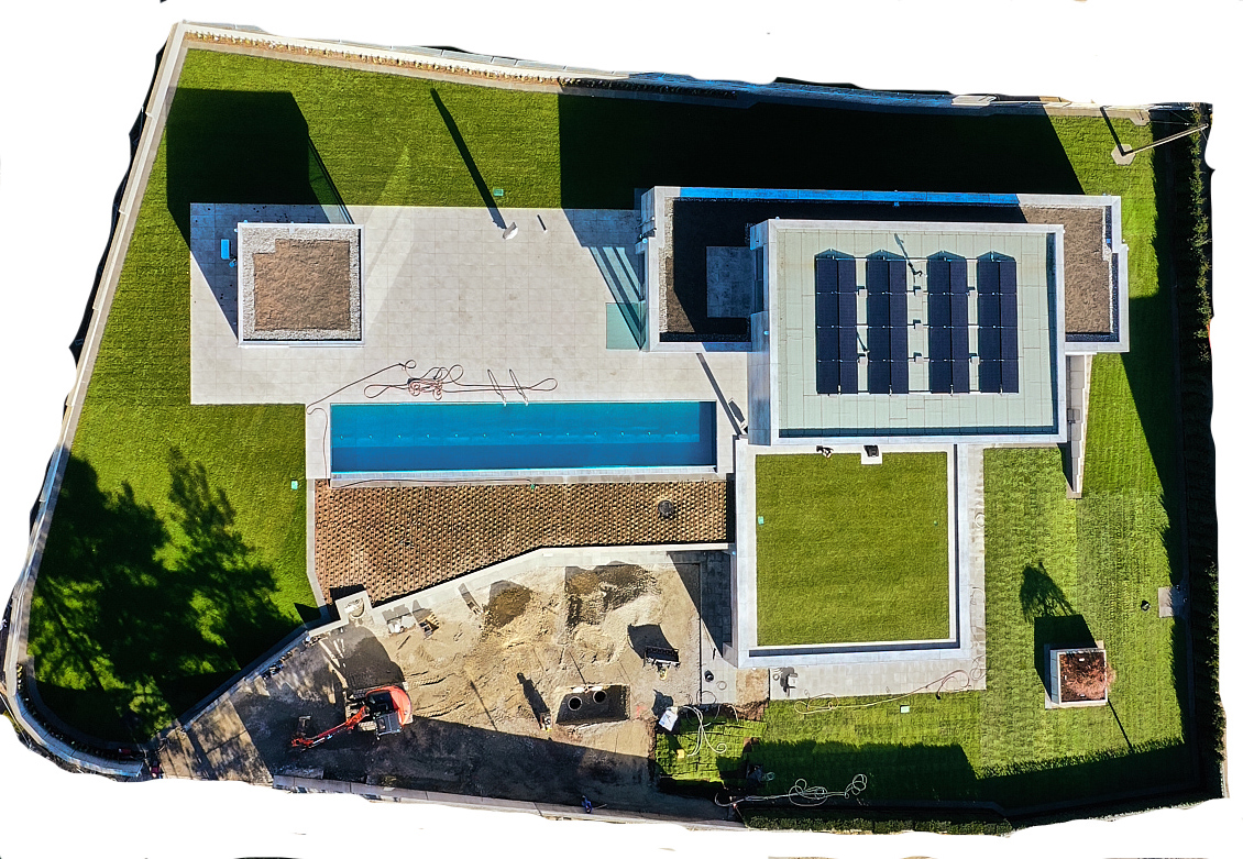 In die Einfahrt kommt ein Pflaster mit breiten Fugen für Rasen. Bewässerung wird dort auch gelegt.