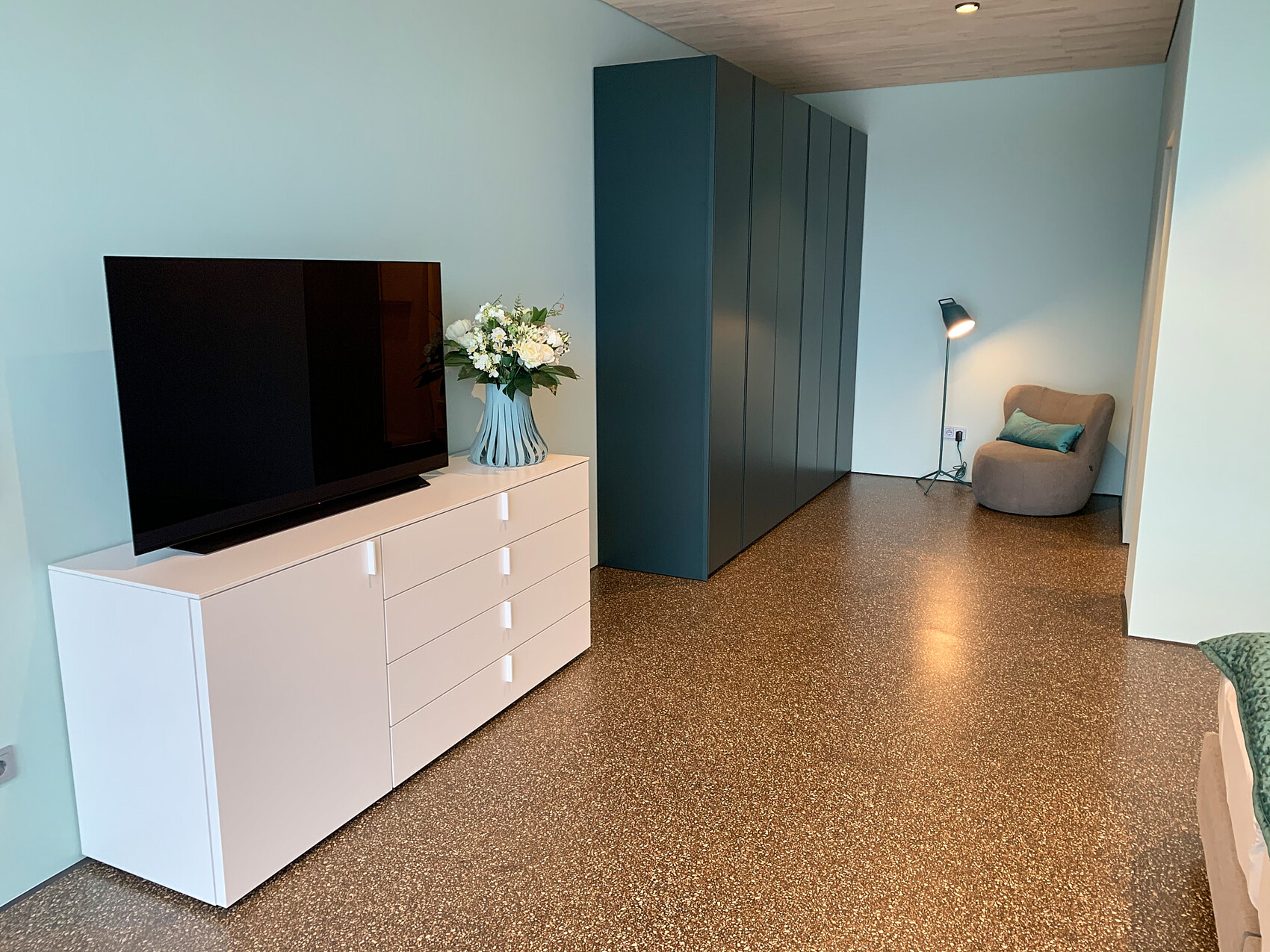hampshire14.12.20 10:44Ein sehr schönes Detail finde ich das Absetzen der Wand vom Boden mit der dunklen Linie statt einer Leiste - das ist in Kombination mir den Möbeln hervorragend gelungen und gibt dem ohnehin schon großzügig wirkendem Raum eine zusätzliche Leichtigkeit.