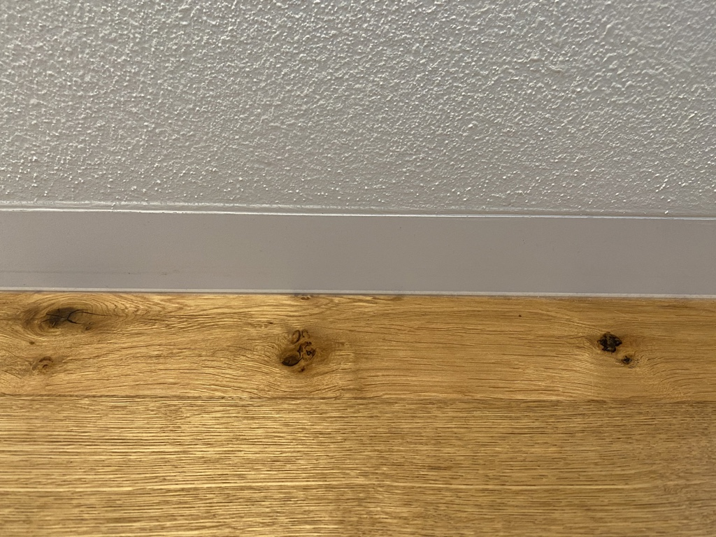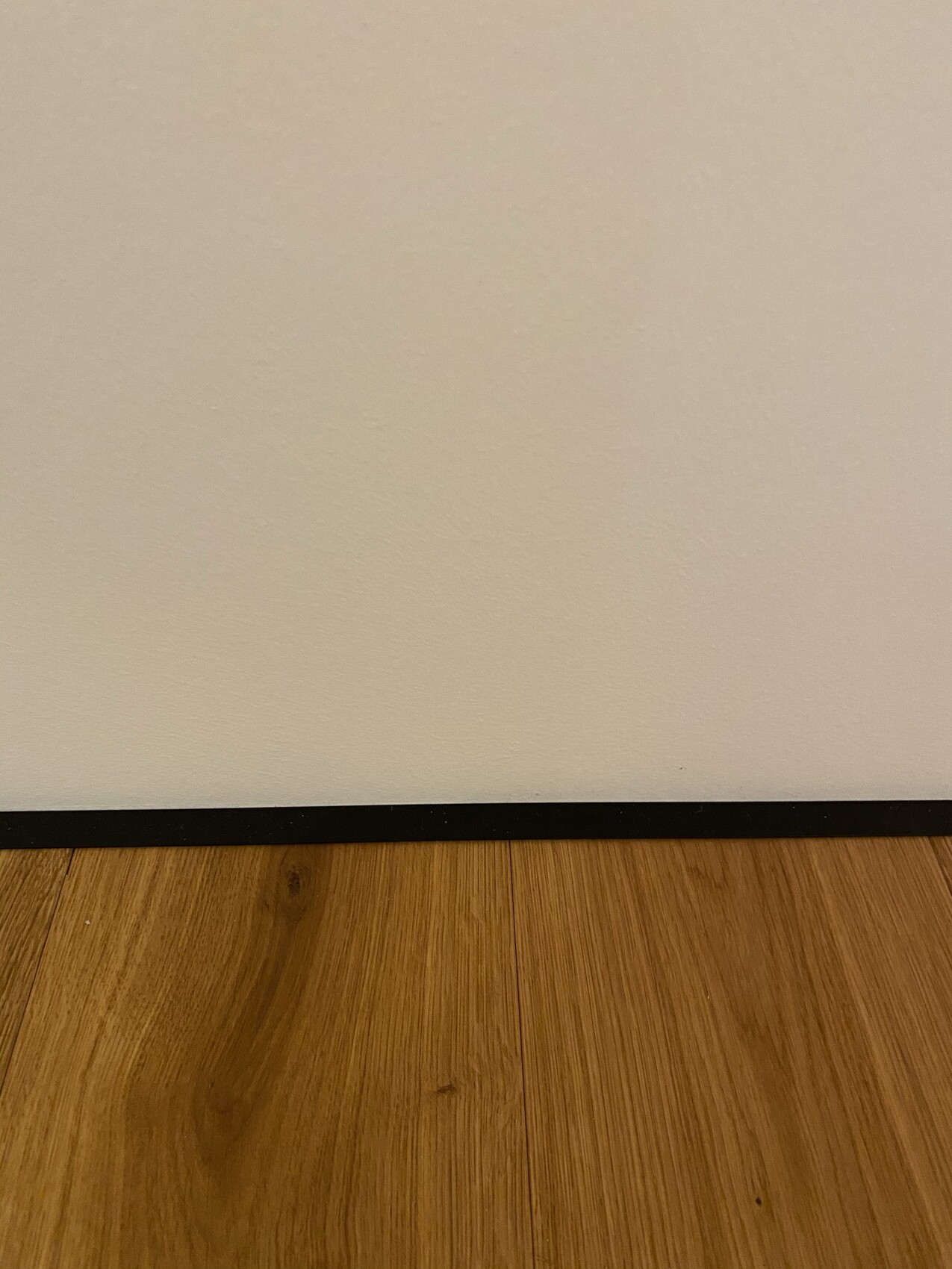 Wie breit ist denn die Sockelleiste auf dem Foto? Sollte man nicht immer ~1cm Abstand zur Wand als Dehnungsfuge halten? Sieht ja fast anliegend aus?