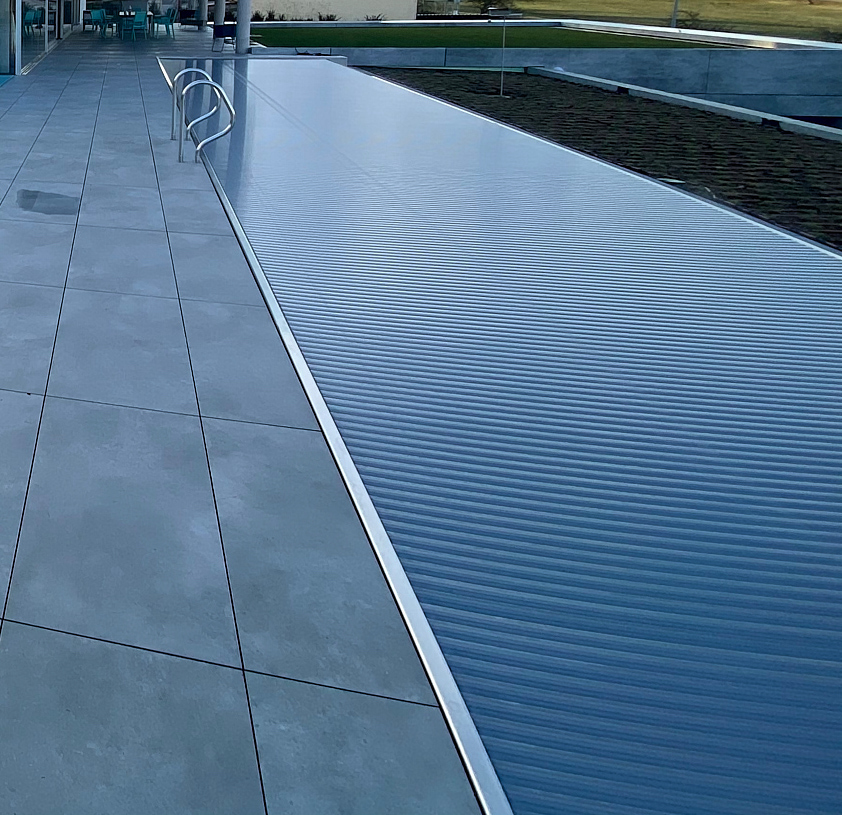 Der Motor und die Abdeckung sitzt in einer Nische im Pool. Davor befindet sich eine entfernbare Wand. Oben ist ein Schlitz aus dem die Abdeckung rauskommt.