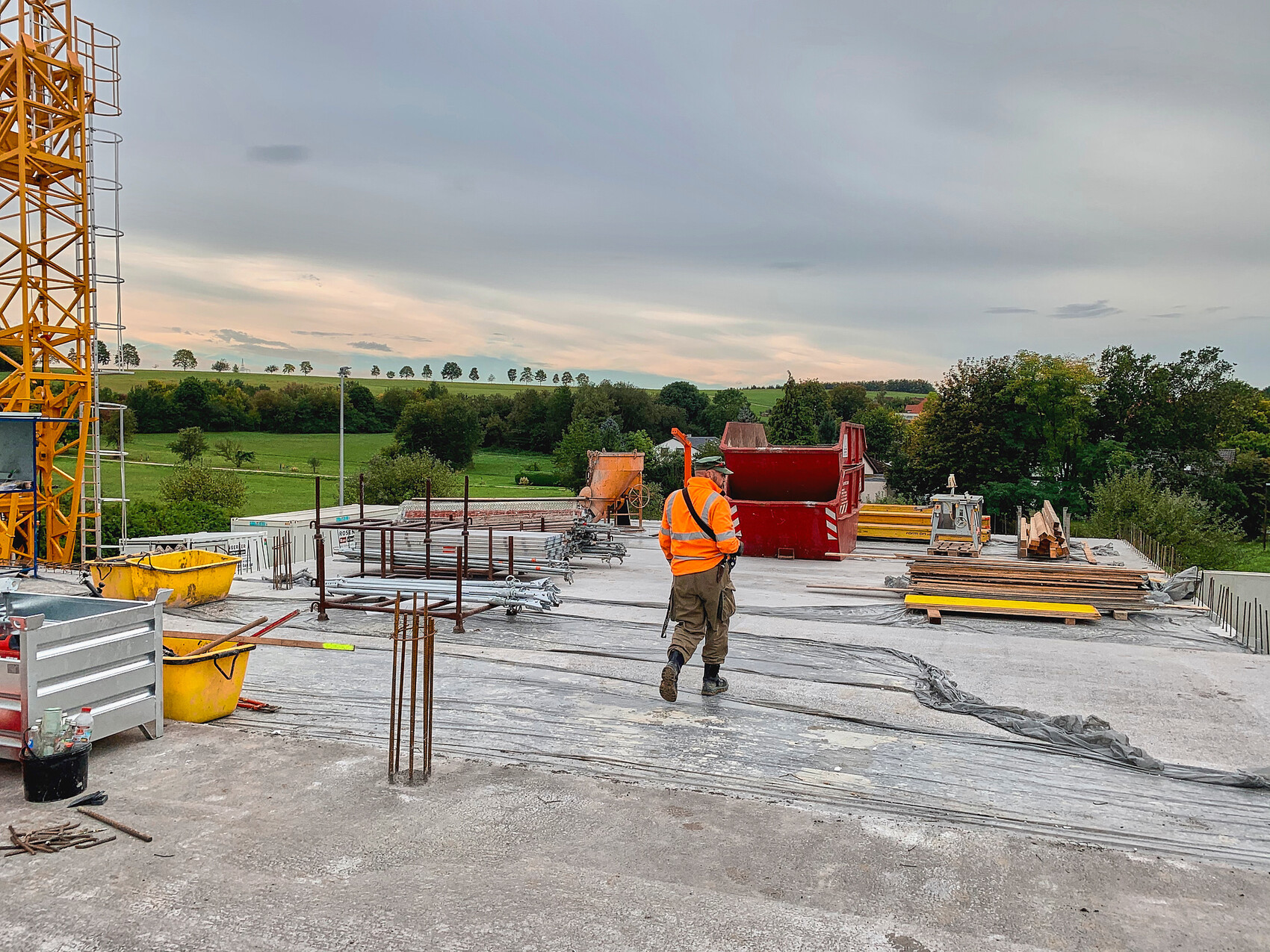 Hinter der Armierung von den Stützen beginnt die Terrasse.