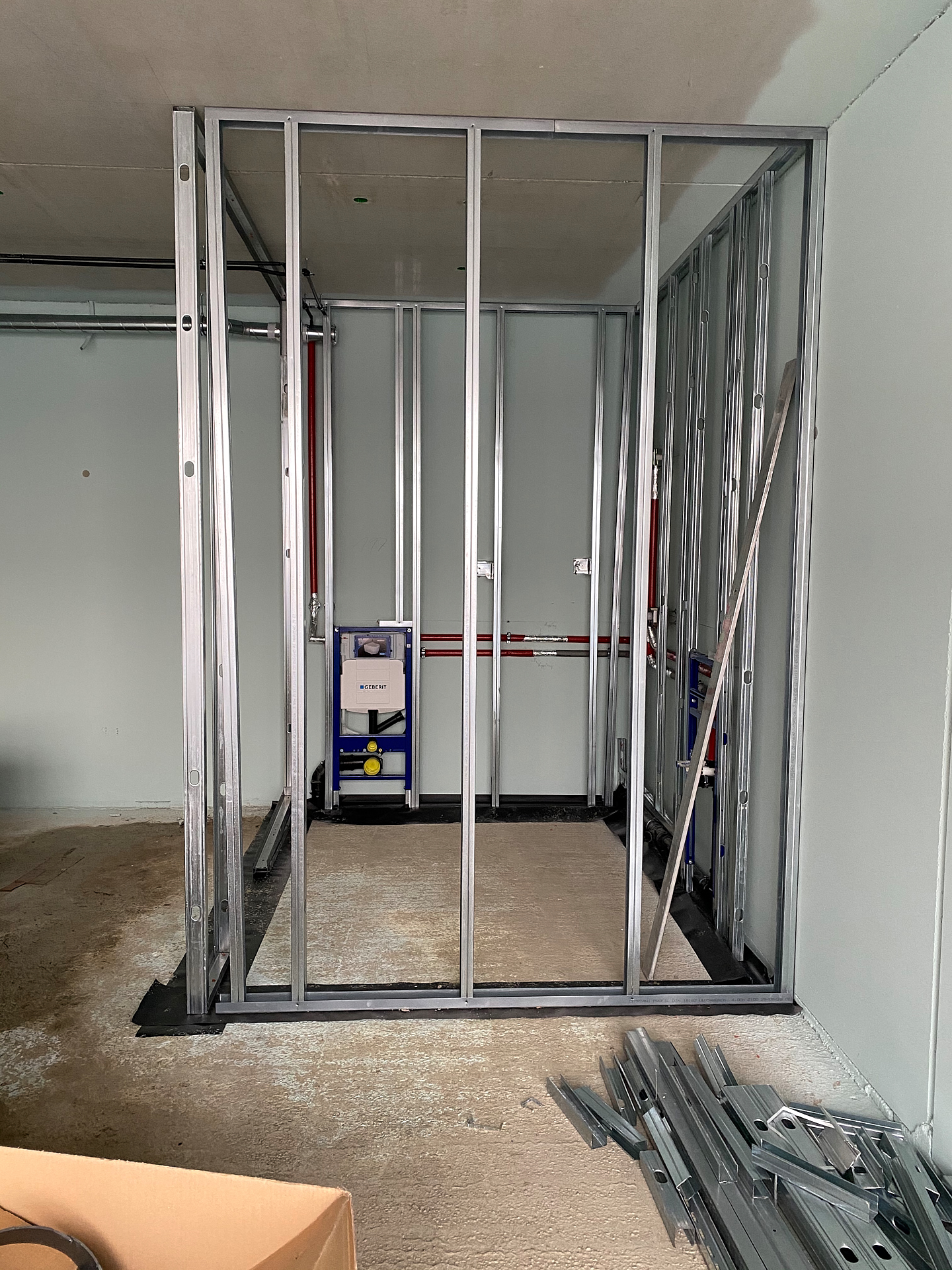 Innen geht die HLS Installation weiter. Trockenbauwände stehen auch teilweise. Hier muss jetzt erst mal der Elektriker ran bevor wir sie fertig Beplanken können.