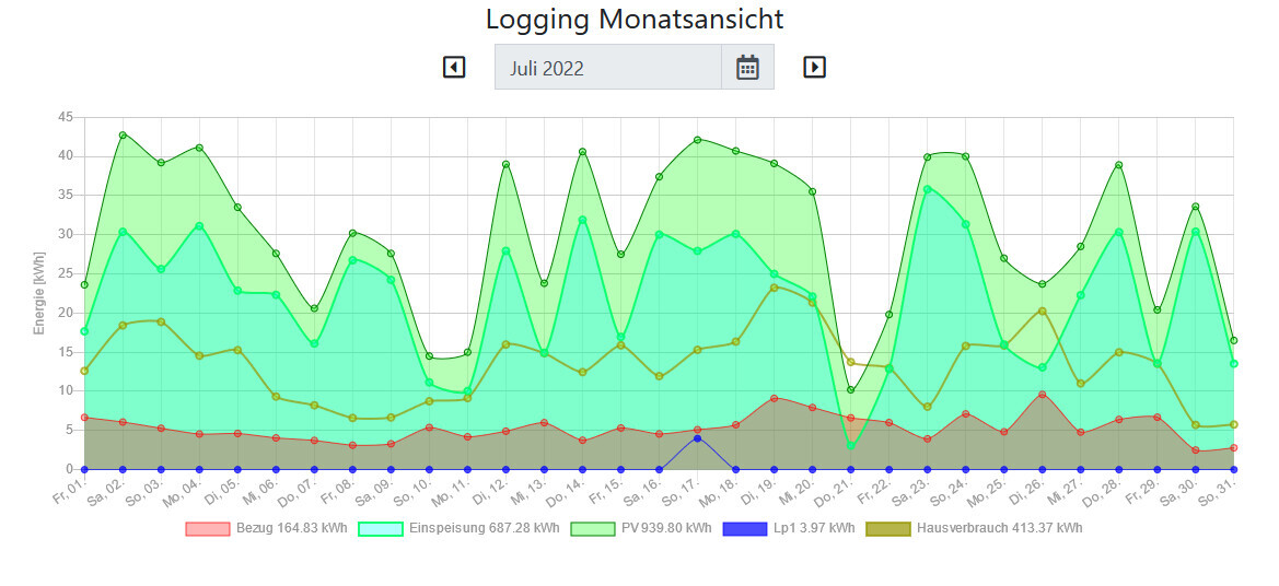Man beachte die durch Photovoltaik erzeugte Energie und die Menge der Einspeisung.