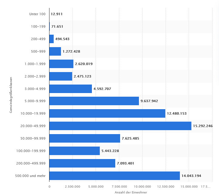 Ist halt die Frage was als "Stadt" definiert wird. Ich hab mal schnell die Verteilung nach Gemeindegröße rausgesucht. Achtung: eine Gemeinde besteht aus mehreren Orten die jeweils kleiner sind, umgekehrt kann eine Metropolregion aus mehreren Gemeinden bestehen. Das Bild ist sicher in beide Richtungen verzerrt.