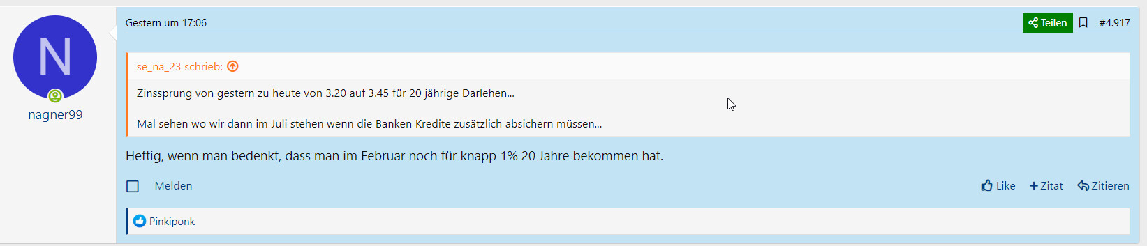 Und ob ich bei 500k und 3% Tilgung 1.666€ monatlich zahle oder 2.666€ macht dann doch einen Unterschied.Diese Rechnung kann man so machen, muss man aber nicht. In der Realität hat unsere Eltern-/Großelterngeneration nämlich bei 7% Zins sicherlich auch keine 3% getilgt. Nimmt man halt die Tilgung runter, ist die Auswirkung wie beschrieben schon weniger dramatisch.Die Sache ist einfach die, dass wohl ganz viele Häuslebauer in der jüngsten Vergangenheit ganz nah am Limit finanziert haben, sprich max. 2% Tilgung oder sogar weniger bei einer Rate die 35-40% vom Einkommen ausmacht. Klar, für diese Menschen ist der Zug jetzt endgültig abgefahren bzw. die müssen jetzt deutlich kleinere Brötchen backen.
