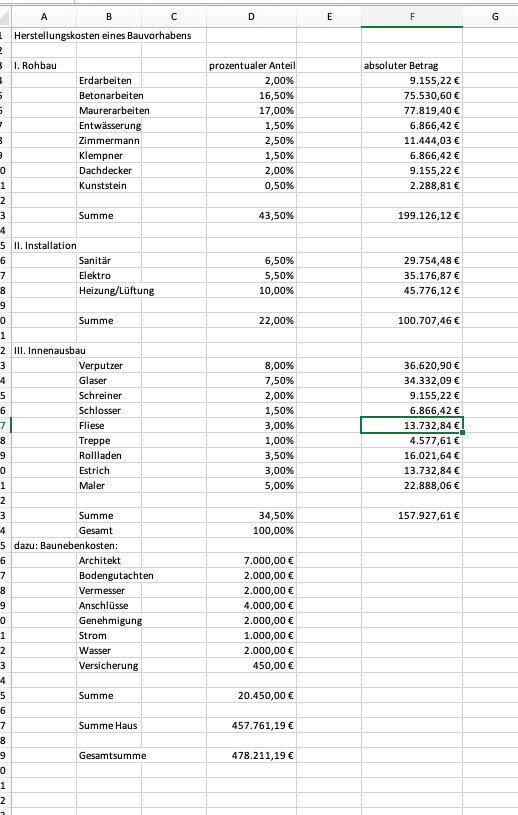 Sicherlich etwas naiv, alle Gewerke so hochzurechnen. Unser Schwager sagt zwar, er kennt die ganzen Handwerker usw. sehr gut, aber ich persönlich würde dann trotzdem den marktgerechten Preis aufrufen.