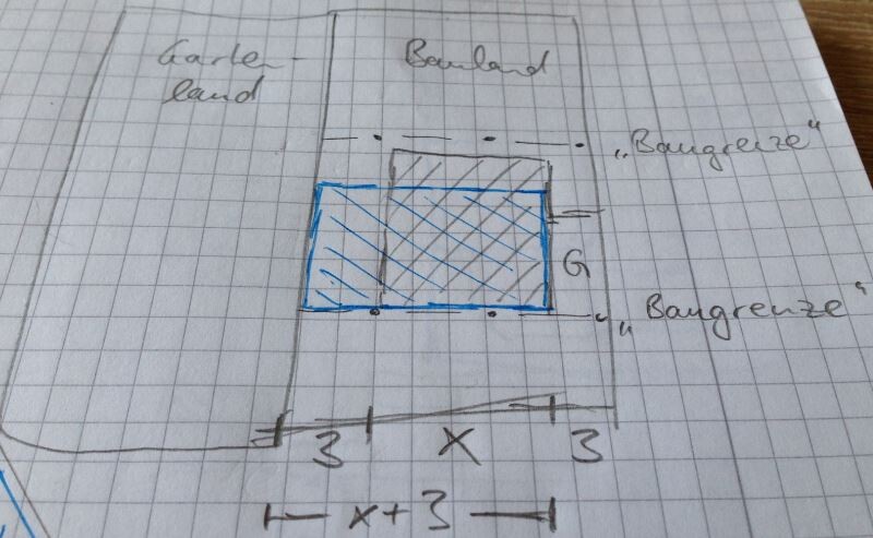 Grau eingezeichnet ist die bisherige Planung mit gezwungenermaßen 3 Metern Abstand nach links zum Gartenland. In blau die Planungsvariante für den Fall, dass uns auch der Garten gehören würde. Wir wollen also gar nicht aus den "Baugrenzen" raus, es geht schlicht darum, die 3 Meter Abstand zur Grenze nicht einhalten zu müssen.