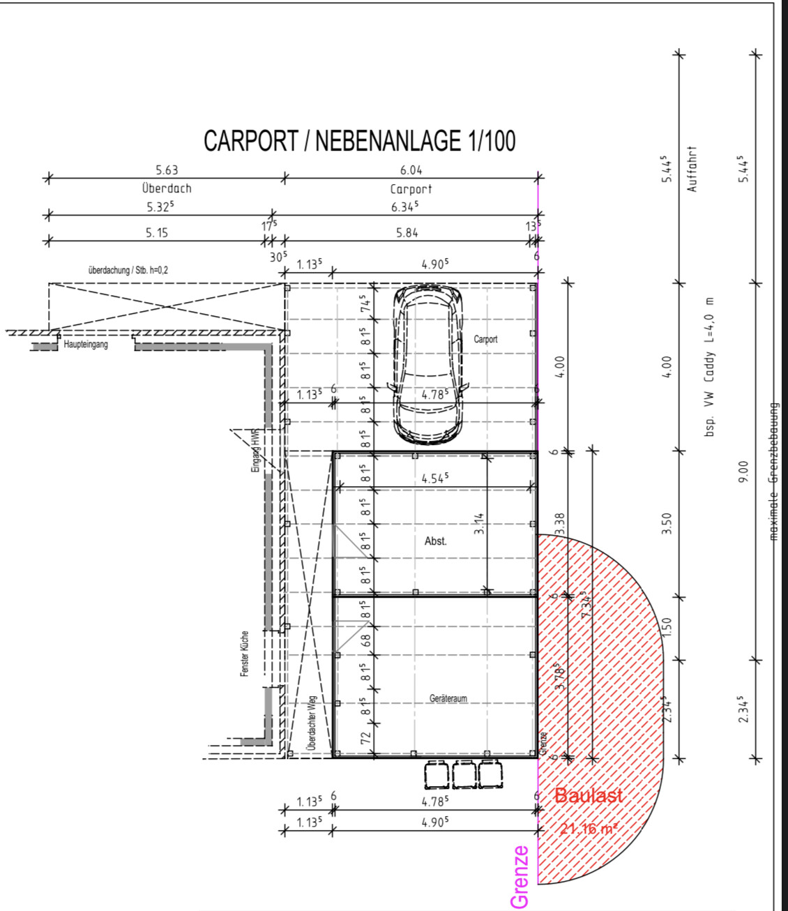 Grundriss: Carport/Nebenanlage mit Eingängen, Grenze, Baulast, Maßangaben (1:100).
