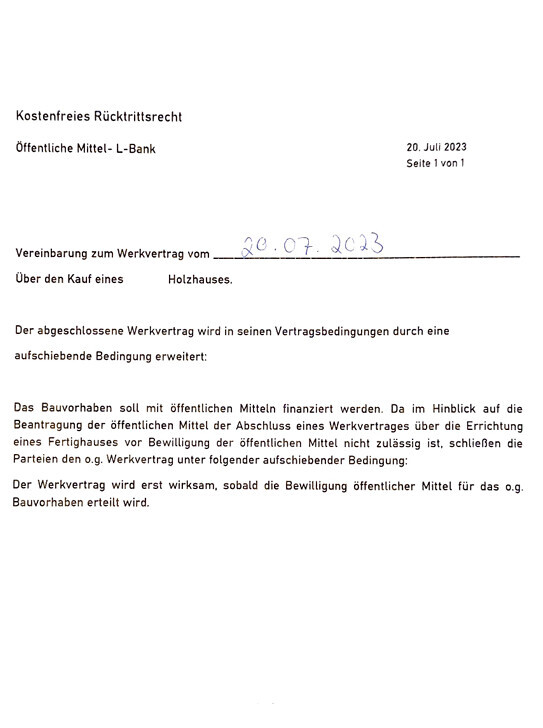 Wenn ihr wirklich alles vor Juli durchbekommt, dann macht eure Frage natürlich Sinn. Kannst du uns den Auszug aus dem Vertrag zeigen? Ohne können wir da nur schlecht weiterhelfen. Vielleicht ist hier ja jemand vom Fach und kann euch da eine erste Einschätzung geben.Anbei mal der Werkvertrag ohne persönliche Daten und die aufschiebende Bedingung zur besseren Einordnung.
