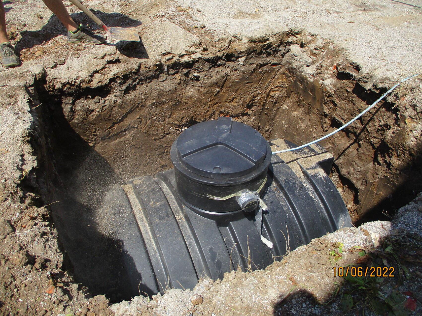 Baugrube mit schwarzem runden Kunststofftank, Rohr, Spaten und Bauarbeiterfuß sichtbar.