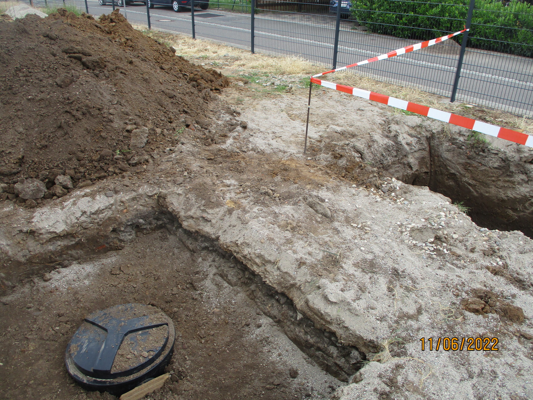 Aushubfläche mit Graben, Erdmassen, liegendem Schachtdeckel und Absperrband vor Zaun.
