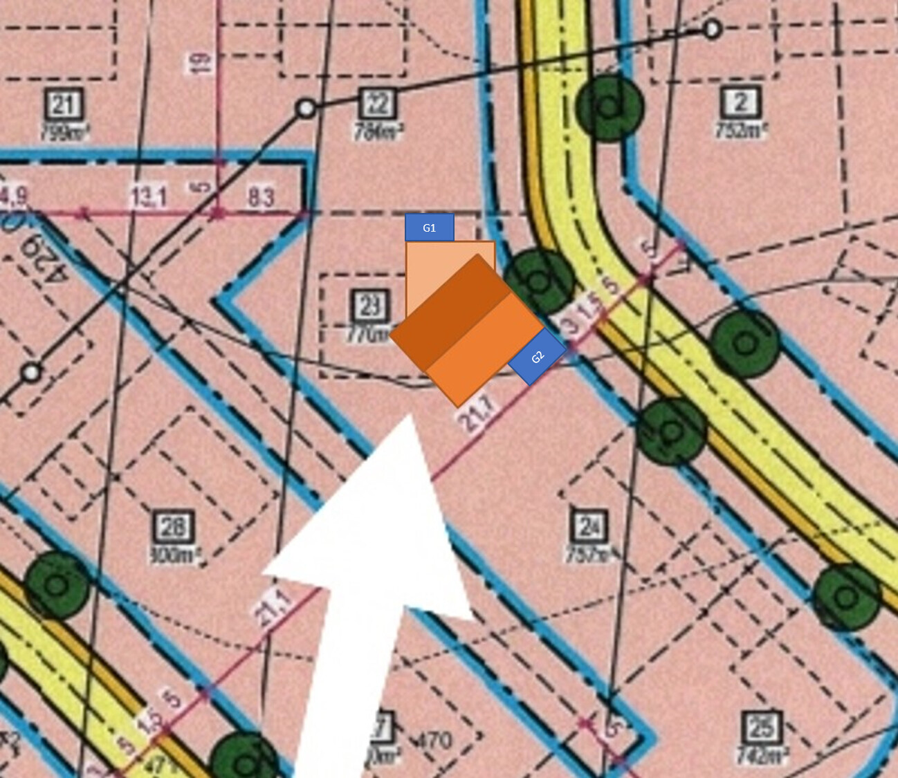 Z.B. so (G1 und/oder G2). Das Haus ist übrigens nicht direkt an der Straße, sondern an der Baugrenze (blaue Linie). Diese hat vermutlich einen Abstand von 3m zur Grundstücksgrenze. Und ja, es ist durchaus üblich ein Haus an eine der Baugrenzen zu platzieren, ist nämlich der einzige Weg, auf der anderen Grundstücksseite einen brauchbaren Garten zu erzeugen.