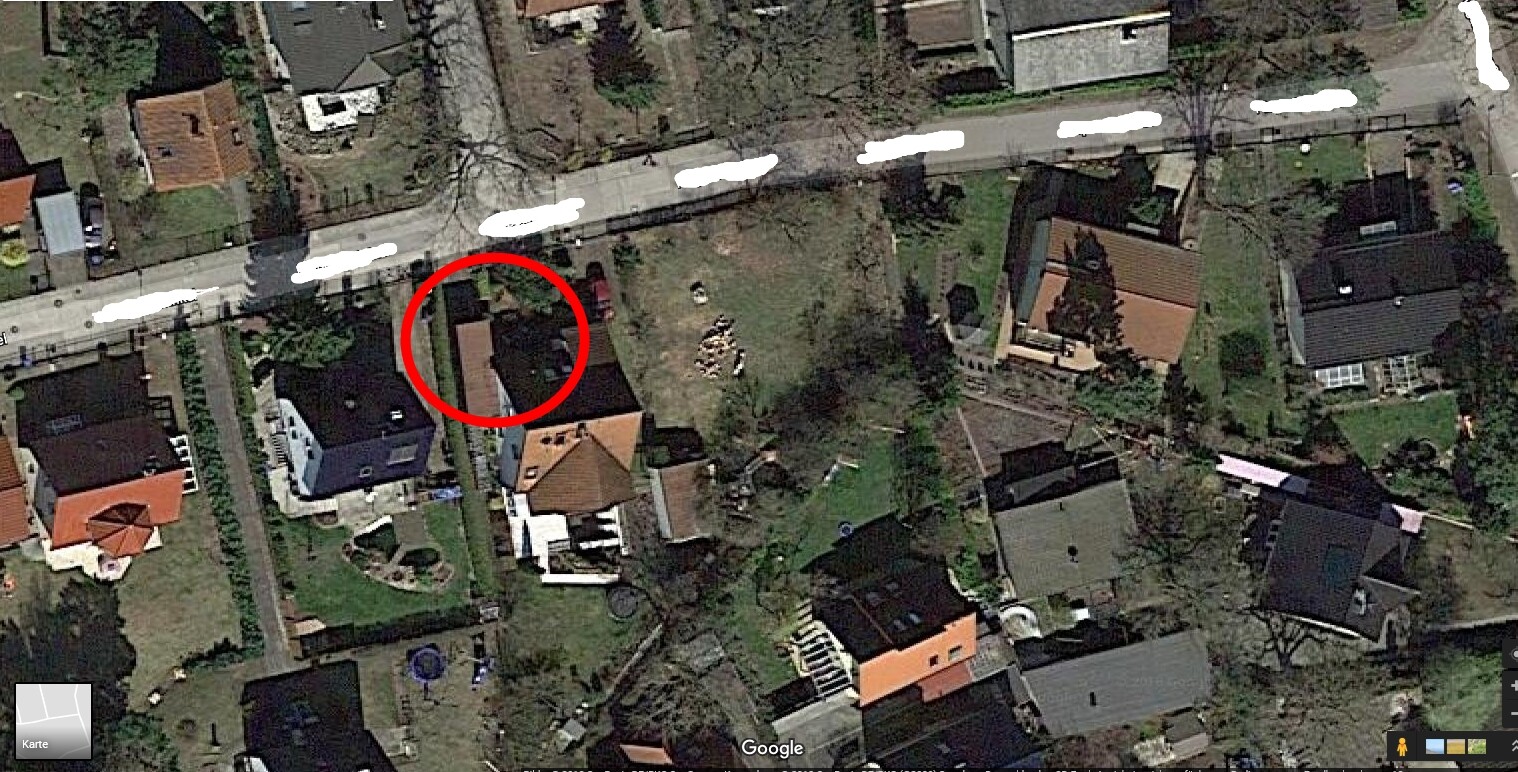 Luftbild eines Wohngebiets mit rotem Kreis um ein Haus