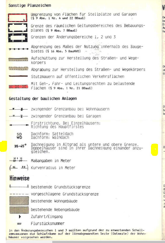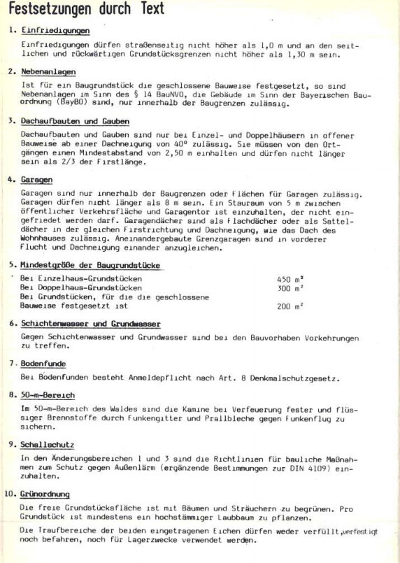 Das hört sich ironisch an.War nicht so gemeint. Ich bitte um Entschuldigung, wenn es so 'rübergekommen ist.Ich bin in #6 nur von weiteren Festsetzungen wie Trauf- und/oder Firsthöhen, oder Klauseln zur Nachbarschaftsanpassung ausgegangen. Da die Ausschnitte in #8 aber auf das Bundesbaugesetz verweisen, muss es sich um einen mehr als 30 Jahre alten Bebauungsplan handeln. Damals waren solche Festsetzungen nicht so verbreitet wie heute. Mit meiner Aufzählung wollte ich nur deutlich machen, dass weitere Festsetzungen aus städtebaulichen Gründen hier auch nicht wirklich notwendig sind, da die vorhandenen genügen sollten, ein optisches Desaster zu verhindern.