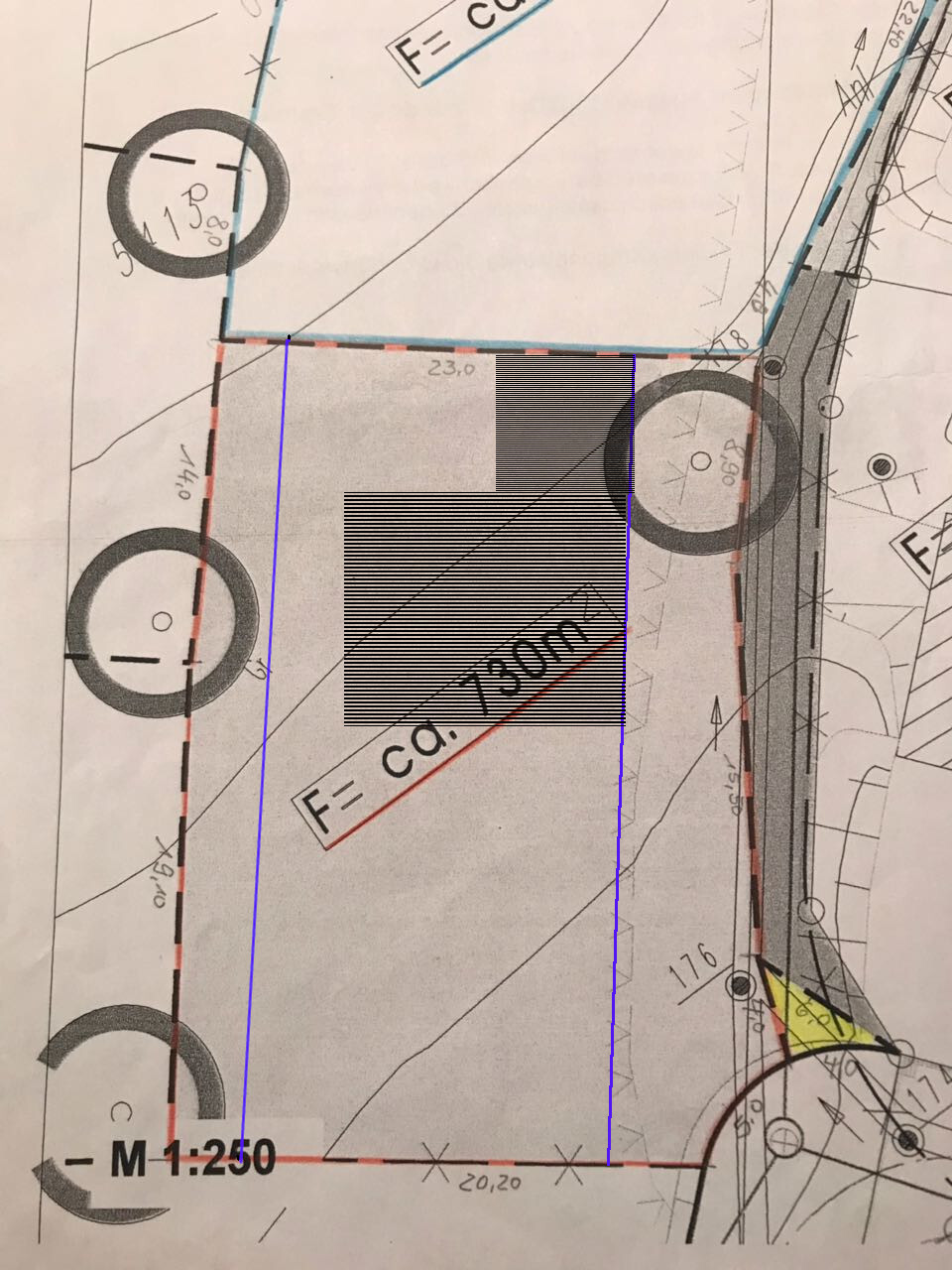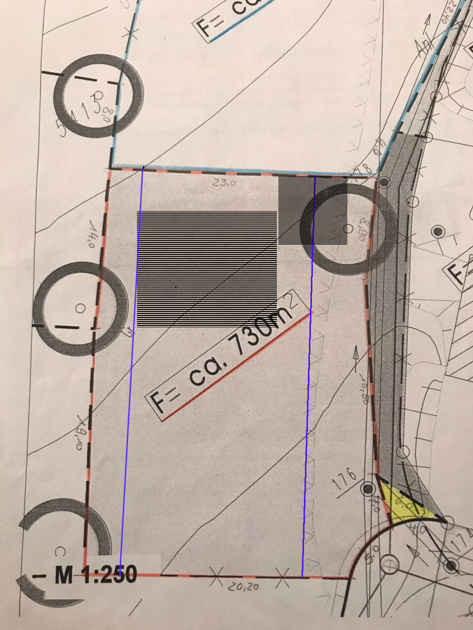 Gefällt mir auch besser als dein Entwurf. Allerdings wurde dein Haus von Katja zu heiss gewaschen, so dass die Proportionen etwas täuschen. Am besten das Grundstück mal exakt im Maßstab 1:100 ausdrucken, Planungsrecht (Baugrenzen) rein, genaue Lage des Leitungsrechts rein, deinen Entwurf im gleichen Maßstab zeichnen, ausschneiden und hin- und herschieben.Stimmt. Mein Vater hatte noch einen älteren Plan des Platzes (längere Geschichte) in seinen Unterlagen. Ich habe auf diesem Plan (1:250) mal grob das Baufenster eingezeichnet. Was auf dem Plan gut zu erkennen ist, ist das der Kanal auf dem Grundstück des Nachbars verläuft. Leitungen sind allerdings keine Eingetragen, bzw. ich kann keine erkennen.