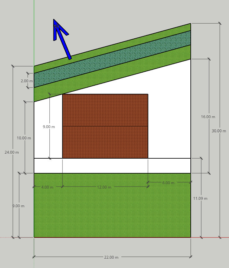 Technische Schnittzeichnung eines Gebäudes: geneigtes Dach, brauner Block, grüne Flächen.