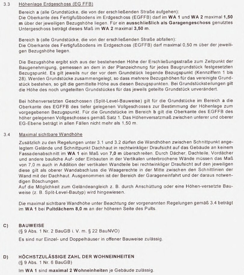 Seiten eines Bauvorschriften-Dokuments mit Abschnitten zu Höhenlage, Bezugshöhen und Wandhöhen.
