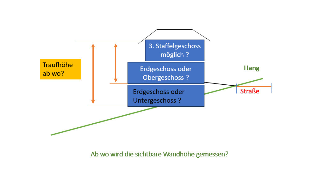 Skizze: dreistöckiges Gebäude am Hang mit Traufhöhe und Frage zur sichtbaren Wandhöhe.