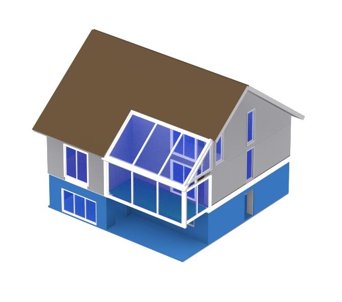 Angenommen wir kleiden die Terrasse mit einem Kaltwintergarten ein, sodass die zurückversetzte Fassade im Wintergarten liegen würde. So in etwa: