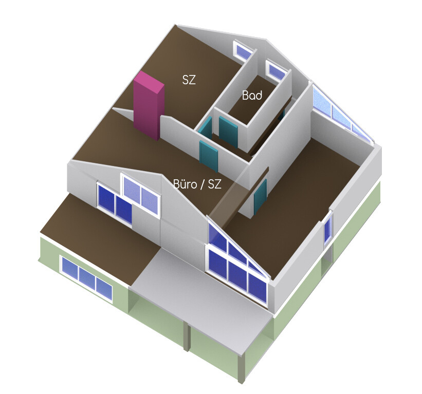 Hier die Grundrissskizze der O/W-Variante, die transparenten Wände sollen uns später flexibilität geben. Je nachdem wie viele Heimbüros & Schlafzimmer wir mal brauchen.