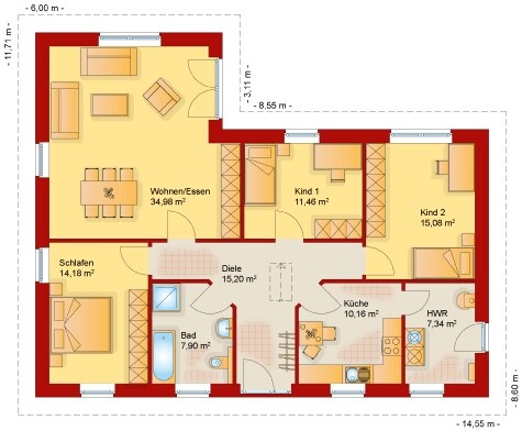 Wenn man sich im EG folgende Räume vorsieht:
