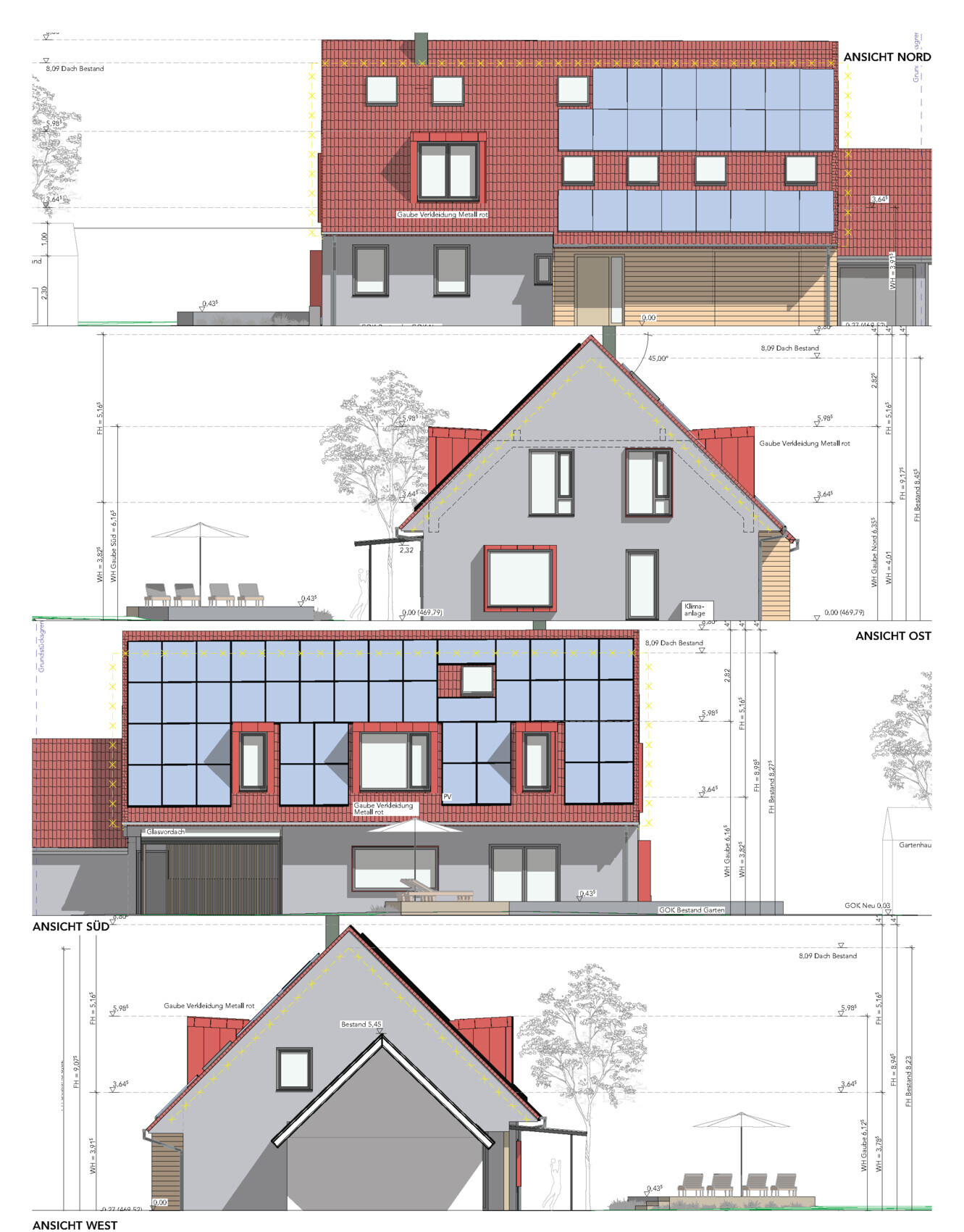 Nordseite wird vermutlich die unterste Reihe Photovoltaik entfallen zwecks besserer Optik. Gauben aus Kupfer. Fassade Betonoptik, Dach rot, Verkleidung Holz bei Eingang und flächenbündigem grossem Garagentor.
