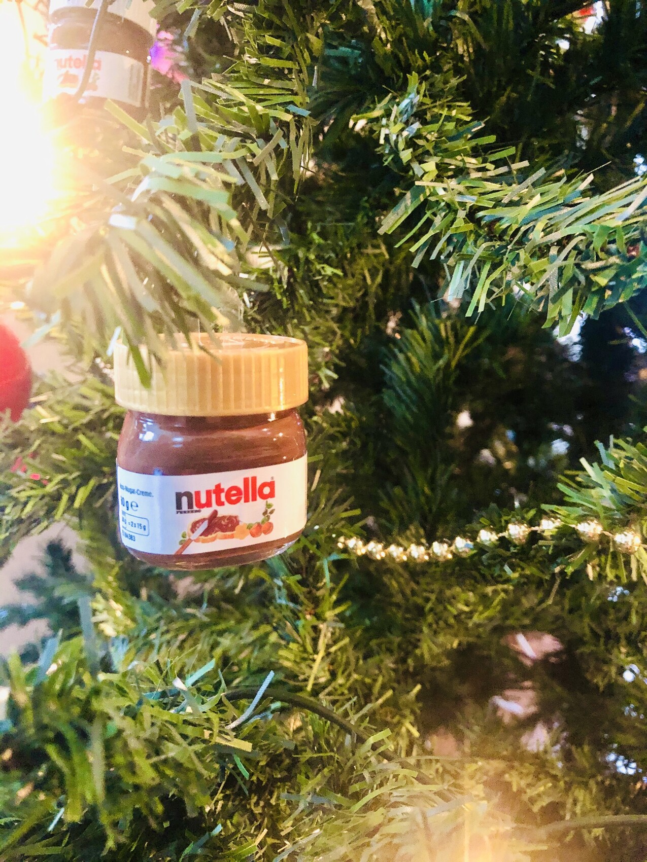 Kleines Nutella-Glas hängt an einem Weihnachtsbaum mit Lichterkette.