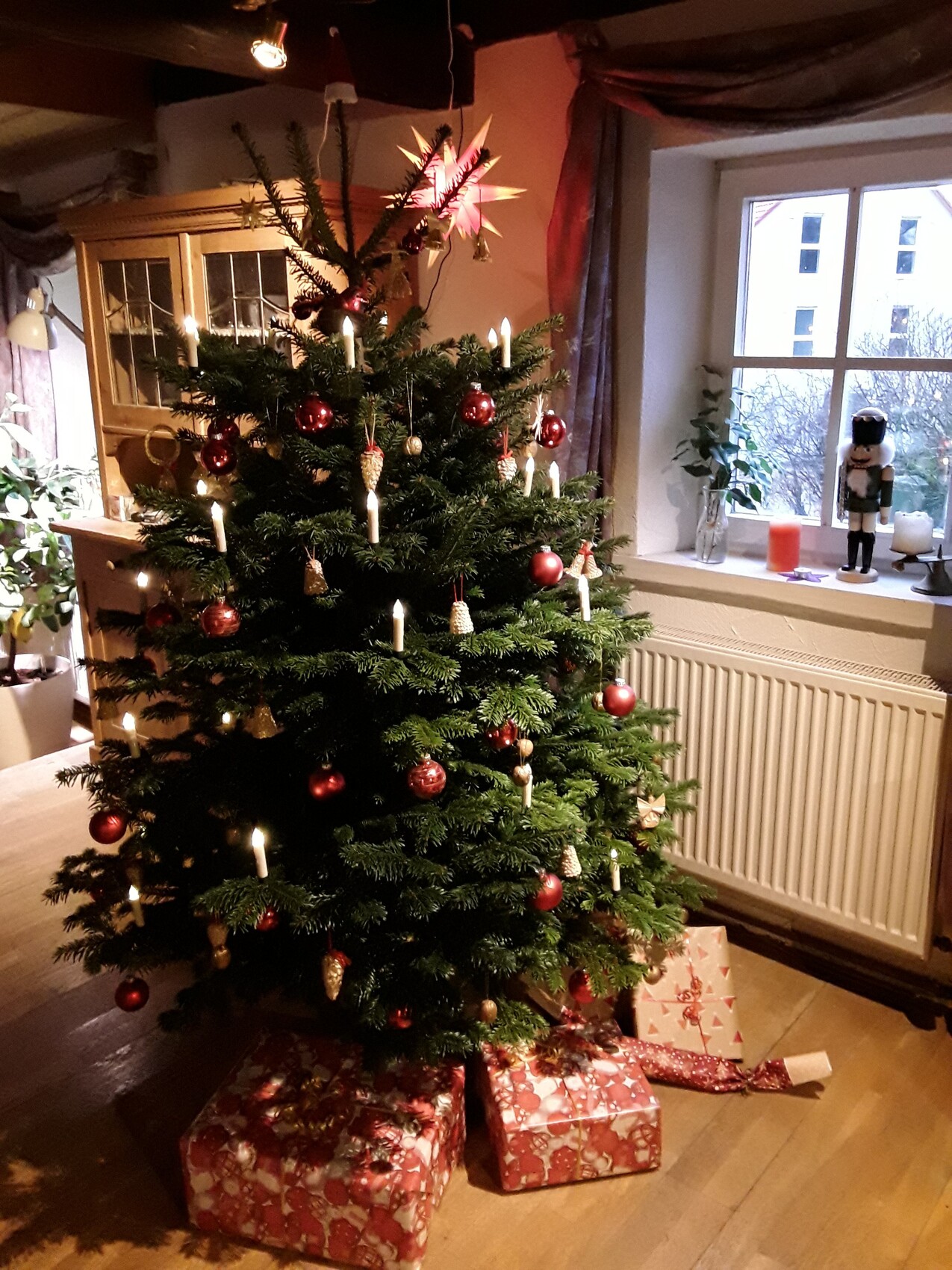 Unserer ist wunderschön und war wieder das Weihnachtsgeschenk unseres Bauunternehmers. Ein Baum plus Bratwurst und Glühwein auf seiner Plantage, man geht übern Acker, sagt welchen man will, einer von seinen Knechten kommt und sägt ihn ab, ab ins Netz, seine Sekretärin hat ne Rentiermütze auf und verteilt Essen und Trinken. No Fake News, all true. Karsten