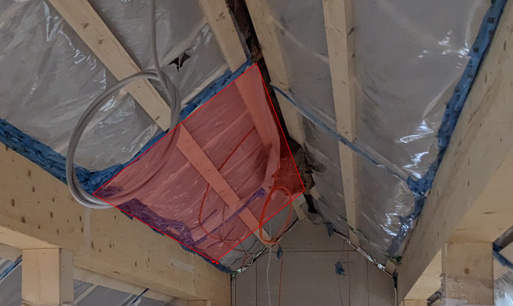 Dachboden-Bau: Holzkonstruktion, Dämmung, Folie, Rohre und Kabel sichtbar.