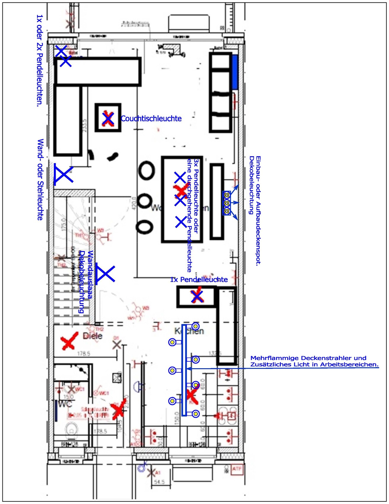 -Im Wohnzimmer planoben links 1 bis 2 Pendelleuchten als Funktionslicht zum lesen (separater Schalter/Taster dimmbar).