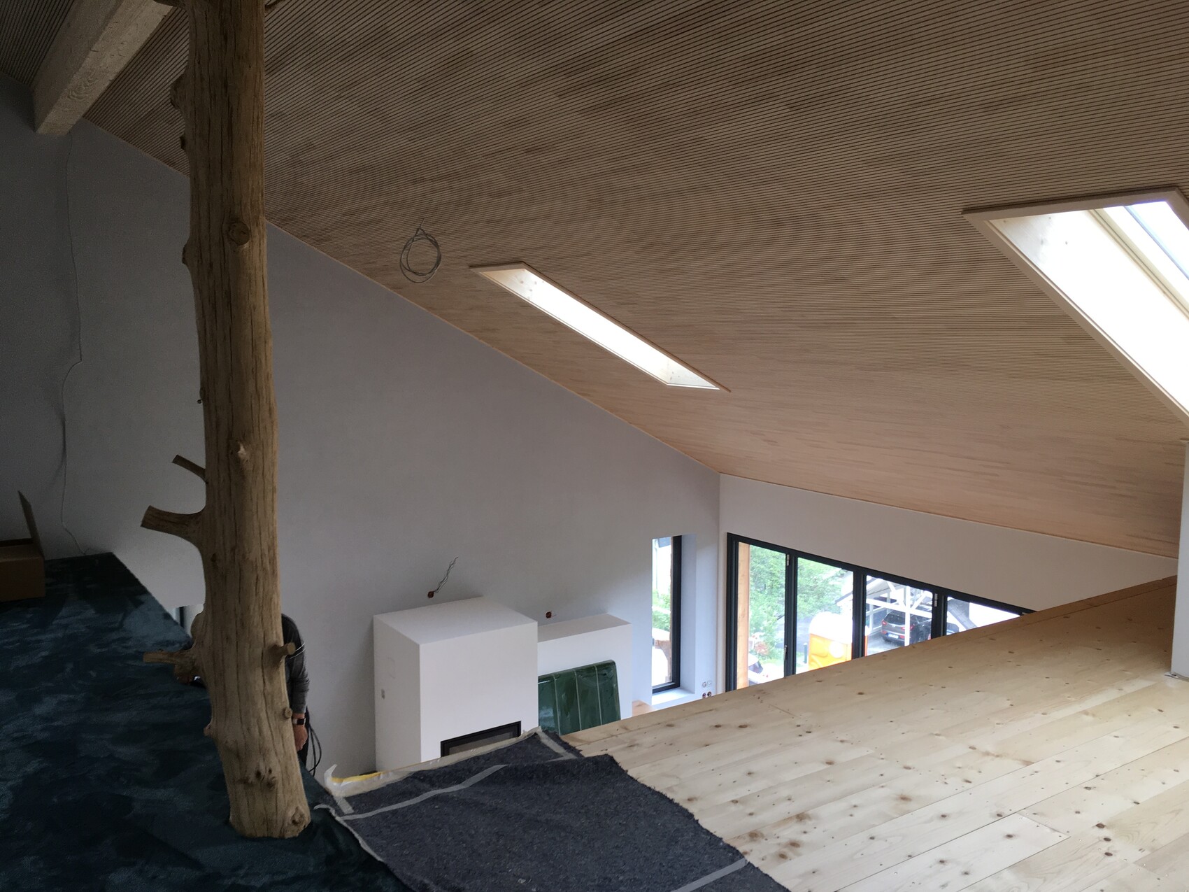 Loftartiges Dachgeschoss mit Holzfußboden, Baumstamm-Säule und großen Dachfenstern.
