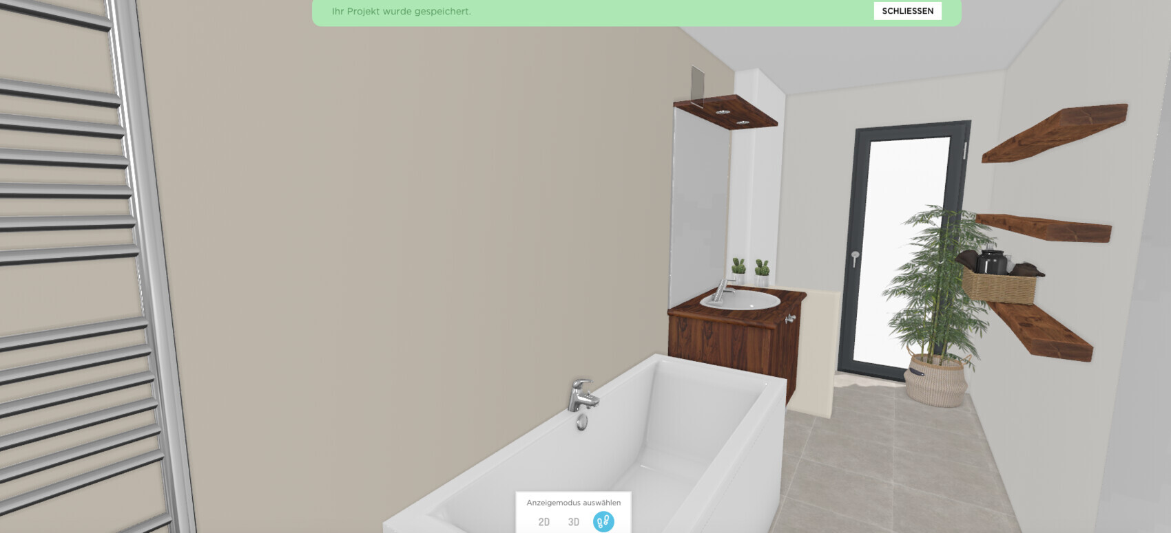 Modernes Badezimmer mit weißer Badewanne, Waschbecken, Spiegel, Heizkörper, Holzregale und Pflanze.